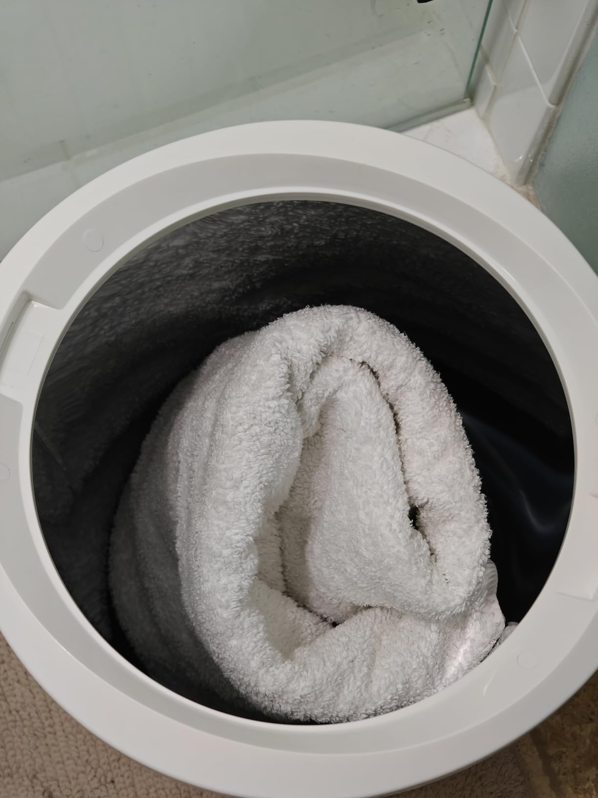 - Drop & Close: Place your towel (or robe) inside the bucket and secure the lid.